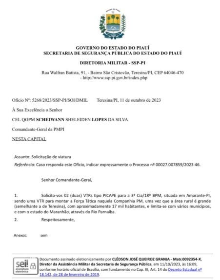 A entrega das viaturas ocorreu em atendimento ao ofício 5268/2023/SSP-PI/SOI/DMIL, encaminhado pelo TC Cledson Queiroz no dia 11 de outubro à Secretaria de Segurança do Estado, em concordância com o TC Valdenei, que destacou a importância dos veículos para a segurança de Amarante e região. “Essas viaturas vão nos ajudar a combater a criminalidade na cidade e na região. Estamos trabalhando para oferecer mais segurança a esta população”, disse.