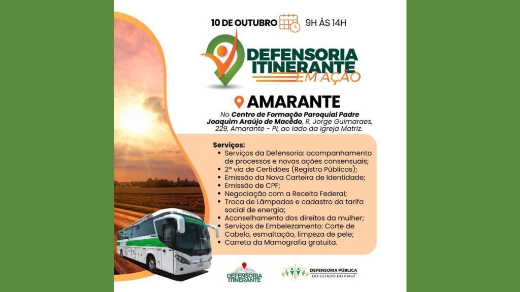 A Defensoria Pública do Estado do Piauí realizará, no dia 10 de outubro, a ação social “Defensoria Itinerante em Ação” no município de Amarante. O…